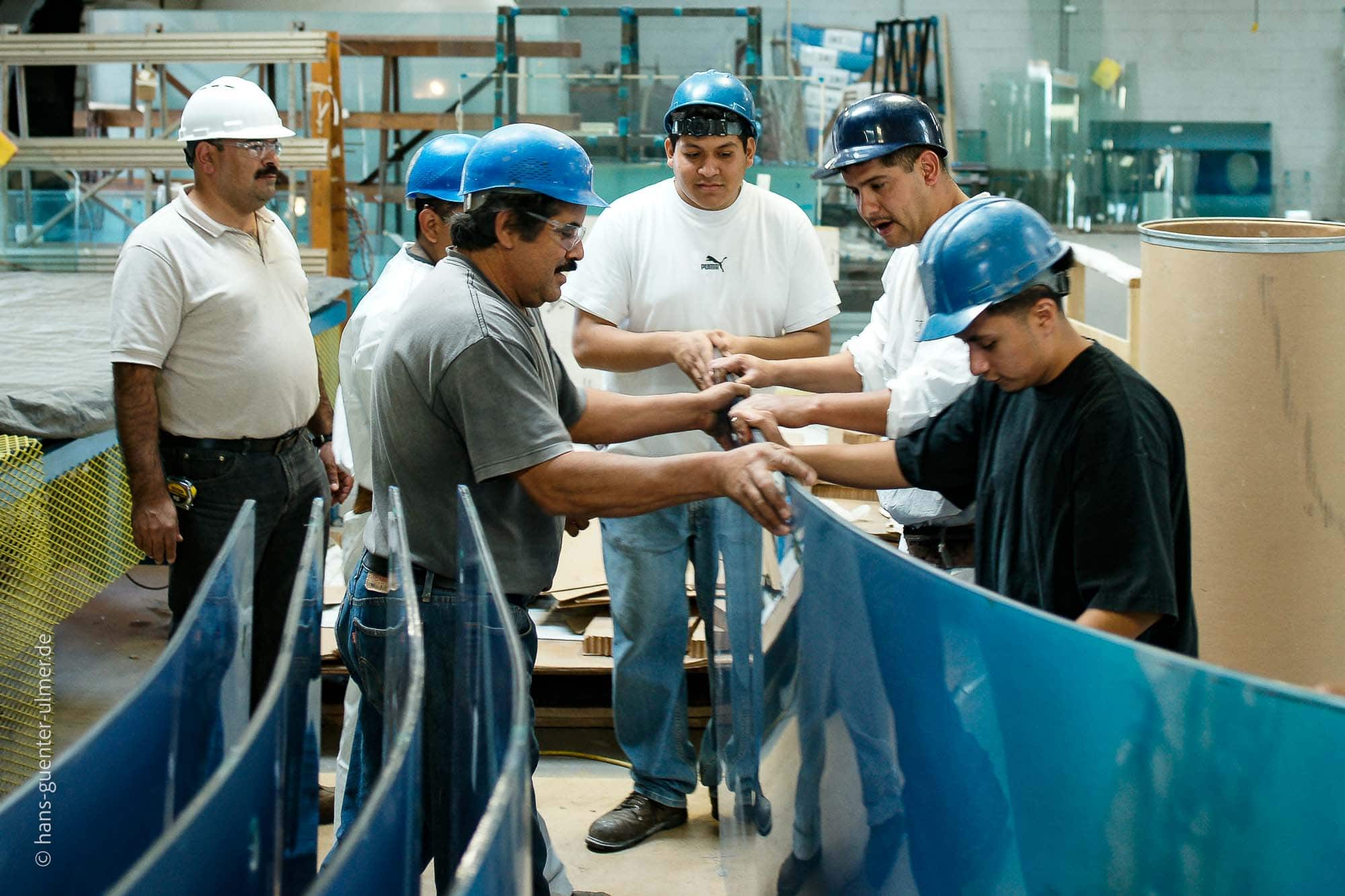 Unterwegs war ich für einen Auftrag in Kalifornien. Hier fotografierte ich den Mann mit der gebogenen Scheibe. Er zeigte mir dann, wie das Glas hier gebogen wird. Dazu wird eine gerade Scheibe auf eine Form gelegt. Die Form wurde vorher passend gegossen oder zusammengeschweißt.