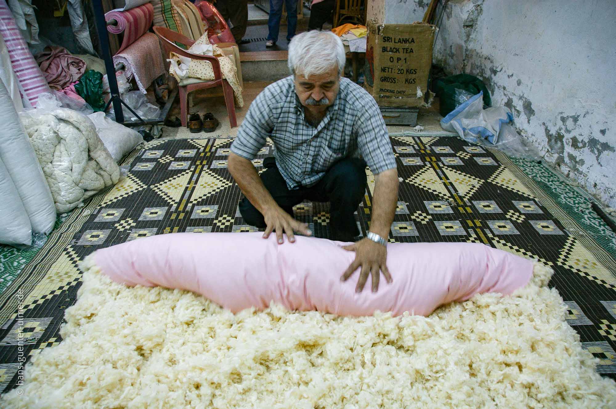 Der Laden war eine sehr lange Garage. Als ich den Laden betrat, zeigte mir der Inhaber, wie er eine Matratze macht. Zuerst legt er den Stoff auf den Boden, dann verteilt er die Wolle auf der gesamten Fläche. Mit einem Stock verwirbelt er immer wieder die Baumwolle, bis sich eine ca. 30cm gleichmäßig hohe Fläche ergibt.